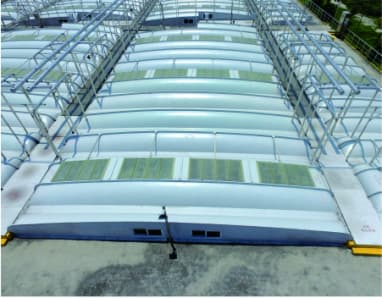 三、优秀的外形设计、强大的荷载能力:我公司选用了最科学的外形设计(已获得国家专利局认证颁发的外形设计专利),玻璃钢罩盖的外形均为弧形曲面,均布活荷载限值达到0. 5Kpa, 并且罩盖的最大挠度不大于L/200(L为罩盖的跨度), 大大提高了罩盖的纵向跨度(目前单跨已超过20m)。